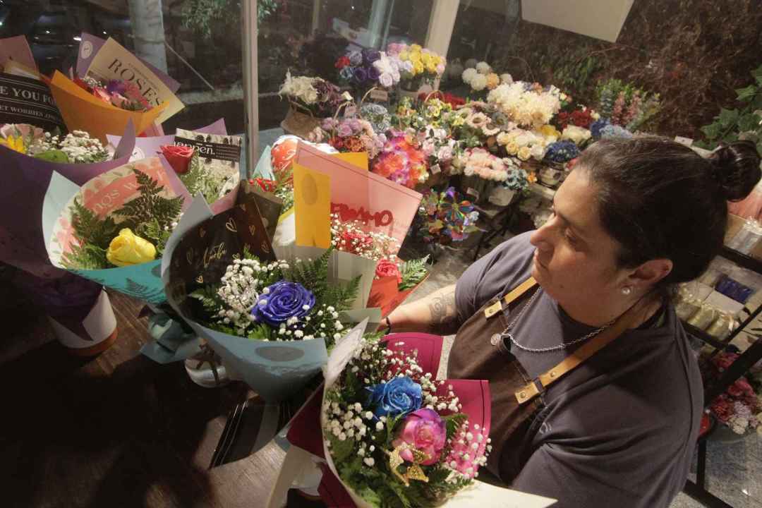 Los comercios retratan en su interior manos que cortan tallos, acomodan pétalos y ajustan moños. Las estanterías están repletas de flores, paquetes apilados y tarjetas esperando ser escritas.