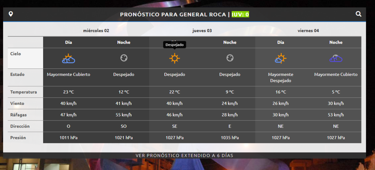 Sobre los vientos aclararon que durante el día las ráfagas alcanzarán los 47 km/h. Sobre la noche incrementarán su velocidad a los 55 km/h.