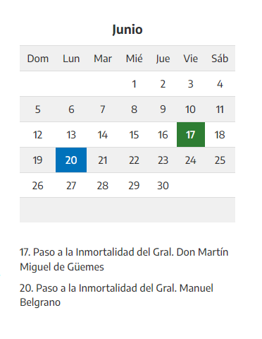 ¿Estás planeando una escapada? A mediados de junio habrá un fin de semana largo. Se trata de los feriados correspondientes al 17 y 20 de junio, en los que se conmemorará el fallecimiento de los próceres Martín Miguel de Güemes y Manuel Belgrano, respectivamente. Así, en menos de tres semanas habrá un fin de semana XL ya que la primera de esas fechas cae viernes y la otra un lunes.