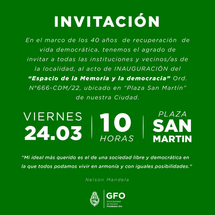 En relación al Día de la Memoria, Verdad y Justicia que se conmemorará este viernes, se desarrollará el acto de inauguración del espacio. Estará ubicado en la plaza San Martín, ubicada en Sarmiento y Villegas.