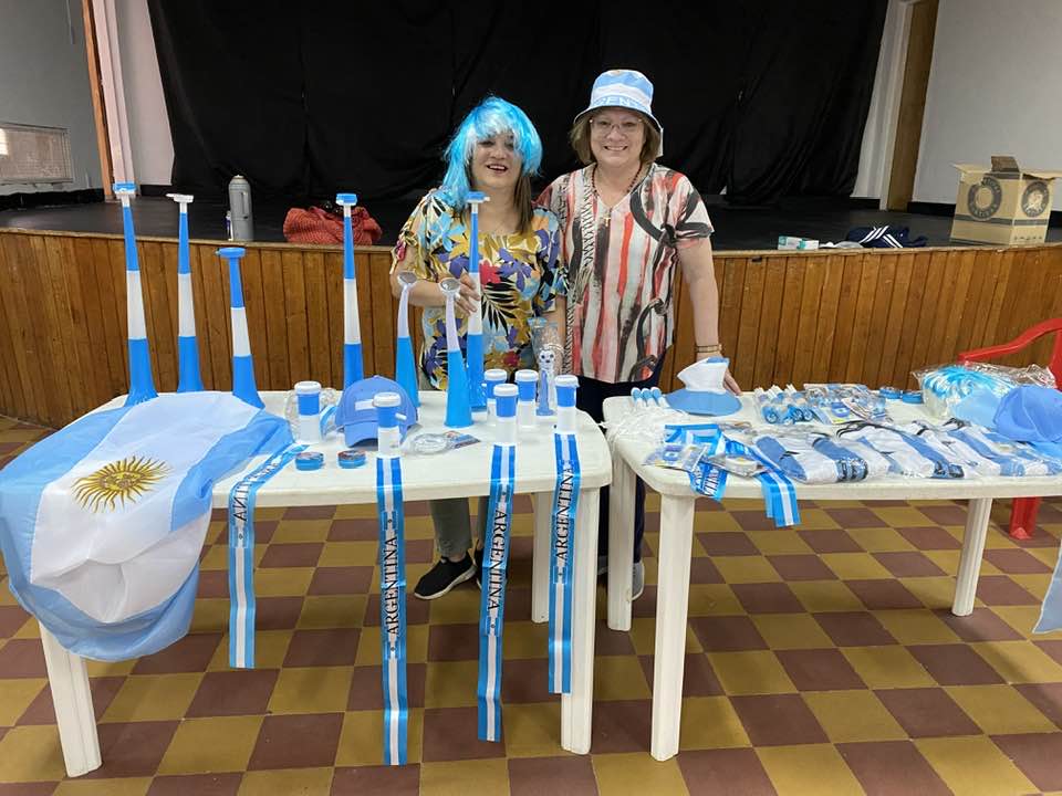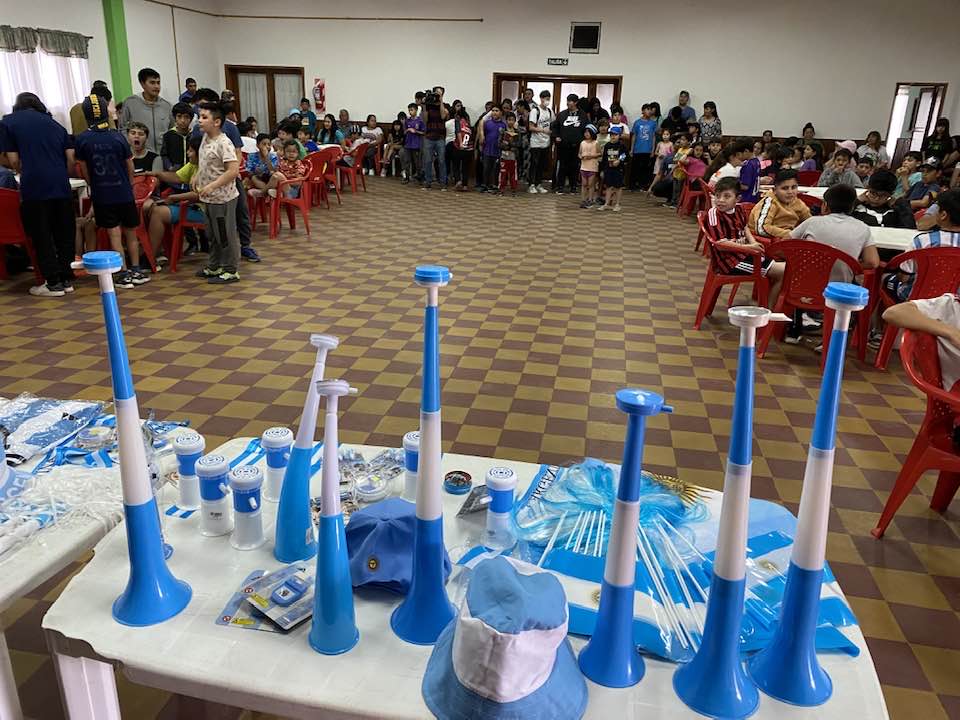 El municipio sorteó y regaló camisetas, banderas y cotillón con los colores celeste y blanco para incentivar a los niños y niñas de la localidad a alentar a la selección Argentina.