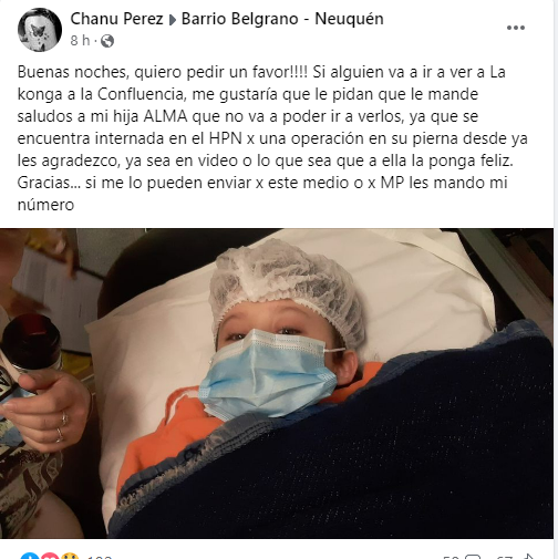 «Si alguien va a ir a ver a La Konga a la Confluencia, me gustaría que le pidan que le mande saludos a mi hija ALMA que no va a poder ir a verlos, ya que se encuentra internada en el HPN(hospital Provincial Neuquen Dr. Castro Rendon)», comenzó su mensaje y agregó que la pequeña fan debe recibir una operación en su pierna. Así también indicó que espera tan solo un video u otro tipo de saludo para poder hacer feliz a su hija.