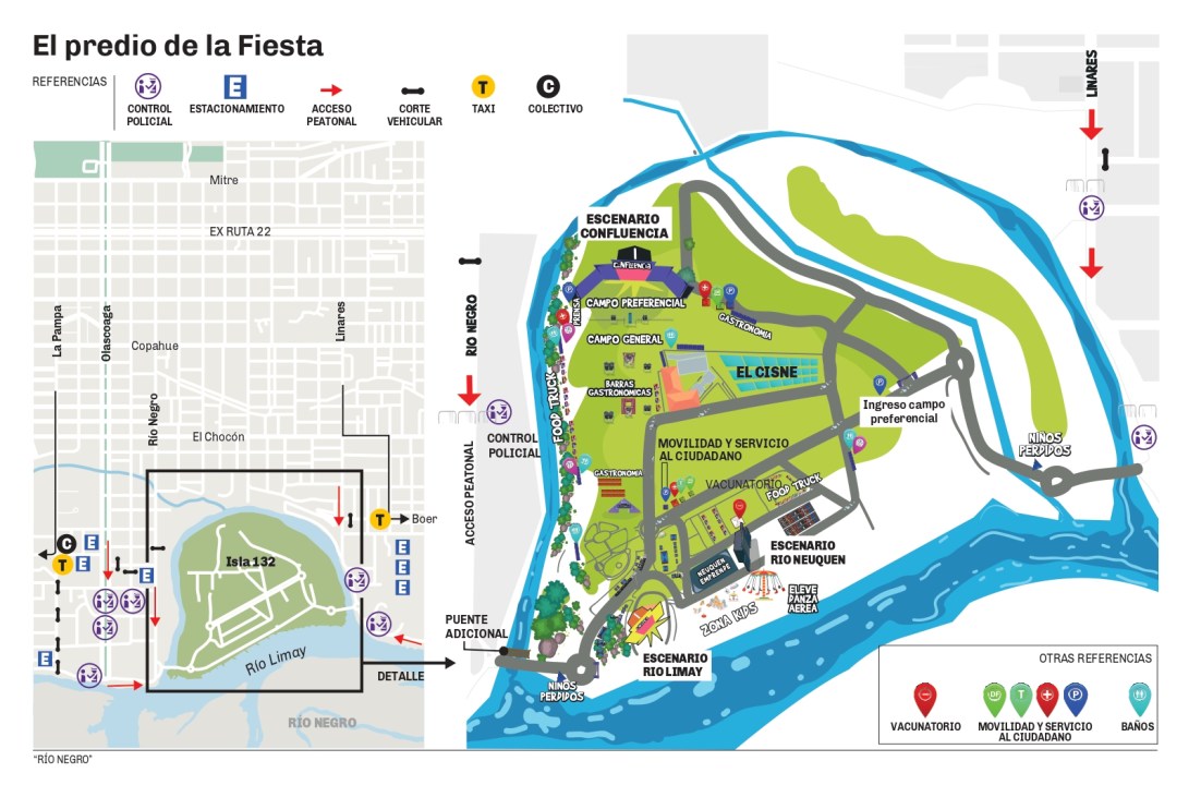Como todos los años toda la actividad estará concentrada en la Isla 132, con vista a la costa del río Limay. Este espacio cuenta con dos puentes de ingreso: uno sobre la calle Linares y otro sobre la calle Río Negro.
