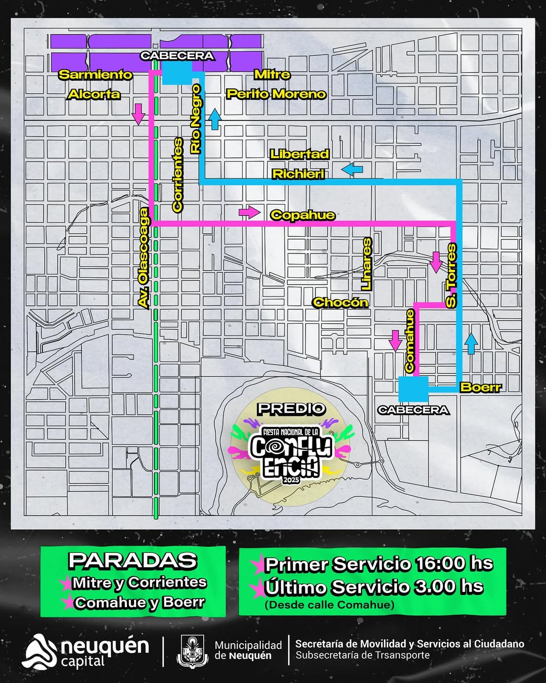 Los colectivos gratis para ir a la Fiesta de la Confluencia salen desde el parque central, en Mitre y Corrientes. Para volver al centro de la ciudad, la parada estará ubicada en Comahue y Boerr, a pocas cuadras del ingreso a la Isla 132 por calle Linares.