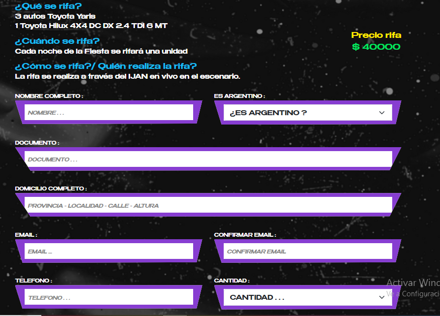 Al ingresar a la web, seleccionas la pestaña del sorteo y te conduce a otra página donde te solicita tus datos personales: nombre, nacionalidad, documento, domicilio, email, teléfono y cantidad de rifas. A su vez, pide la confirmación de la mayoría de edad.