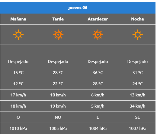 Cuando comience a atardecer y se presente Juan Fuentes en el escenario, será el peor horario de calor. Habrá una máxima de 36°C y una mínima de 28°C. Sin embargo, no habrá casi viento, ya que las ráfagas serán de 5 km/h.