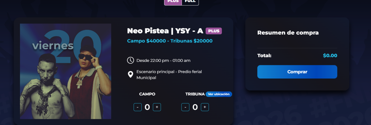 Paso 4: una vez validado y verificado los datos, el sitio de permitirá el acceso para la compra de entradas disponibles. Podés seleccionar por día (viernes 20, sábado 21 y domingo 22).