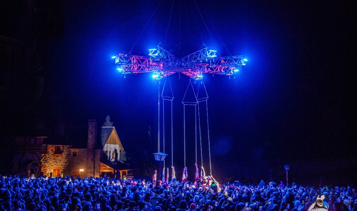 El cielo barilochense se transformó en una tormenta perfecta con el espectáculo aéreo que comenzó puntual a las 20:30 y se extendió durante una hora. La puesta en escena deslumbró al público con una combinación de danza, acrobacia, música, luces y colores que generaron un clima único.