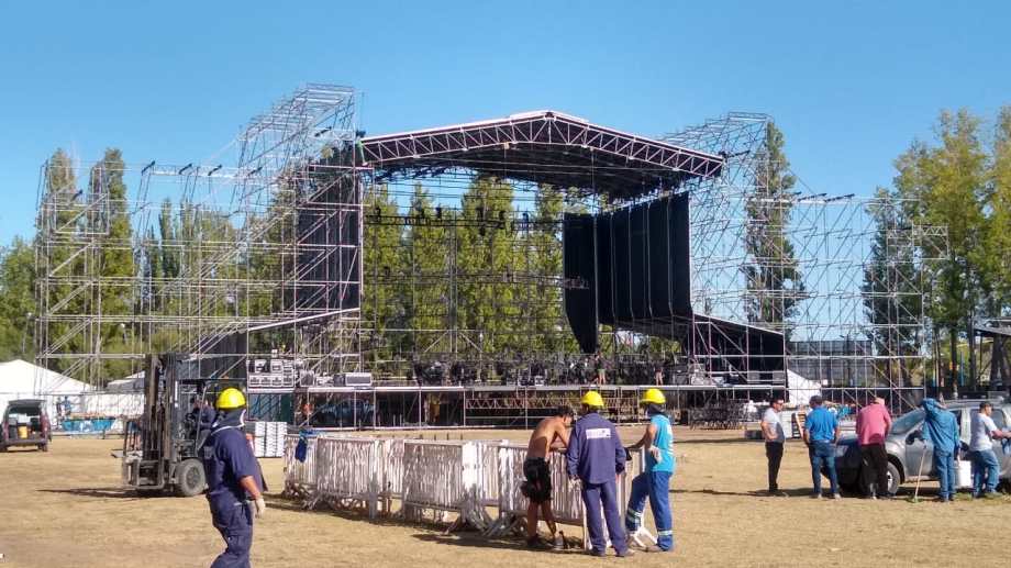 A tres días del comienzo de la Fiesta nacional de la Manzana continúan los trabajos preparando el escenario y las globas donde se desarrollará uno de los eventos más importantes de la región. Comenzará el jueves 23 con la participación de Ciro y Los Persas, y cerrará el domingo 26 con Emilia Mernes y Bizarrap.