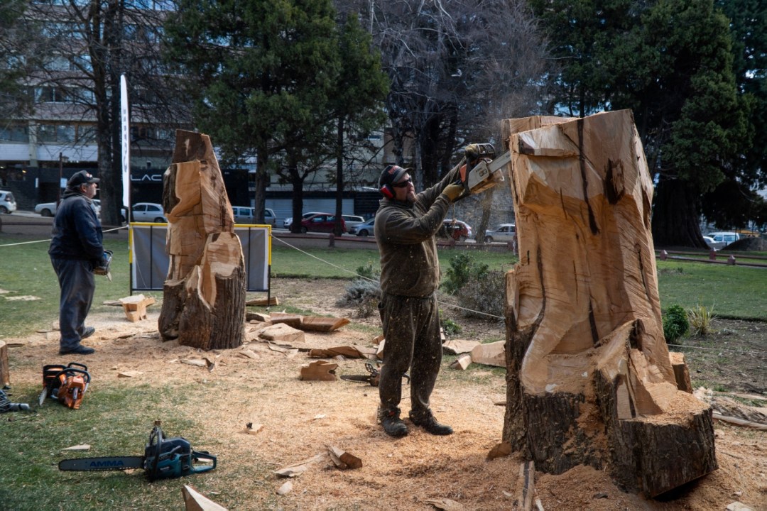 Fiesta Nacional de la Nieve: esculpen figuras en rollizos de ciprés en Bariloche