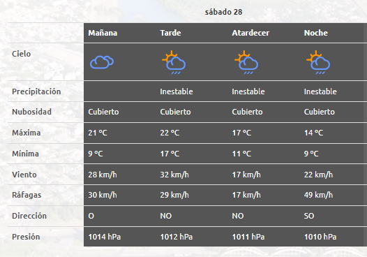 En Neuquén, el sábado tendrá una jornada inestable por la tarde con el cielo cubierto. Las temperaturas oscilarán entre los 9°C y los 21°C. El viento continuará en la capital con rafagas que podráin alcanzar los 49 km/h.