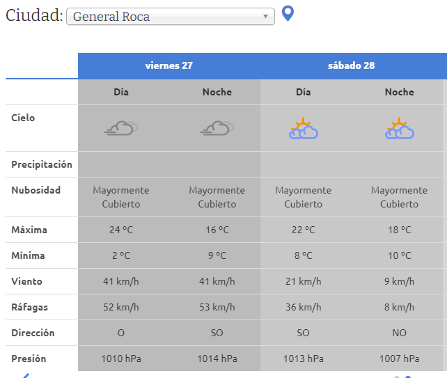 Finalmente el sábado 28, la máxima será de 22° y la mínima de 8°, con ráfagas de viento de 36 km/h durante el día y de 8 km/h durante la noche.