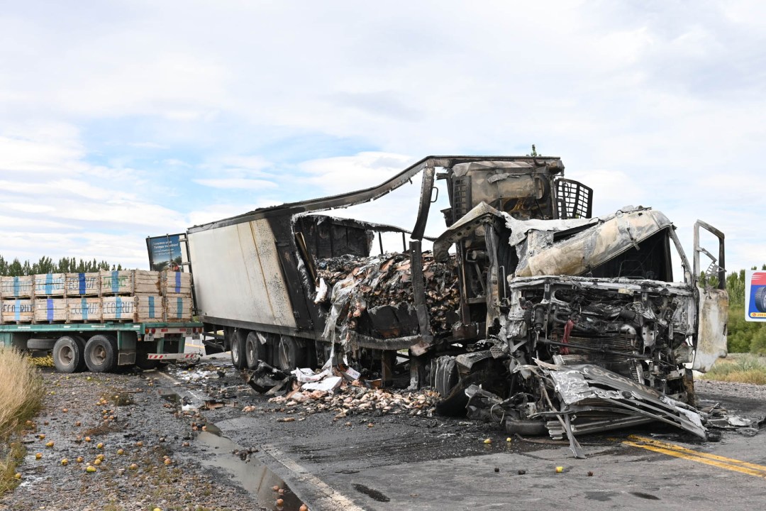 Un camión de gran porte se incendió tras un fuerte choque en la Ruta 22, en la curva de Cervantes. Dos personas resultaron heridas y fueron trasladadas al hospital local.