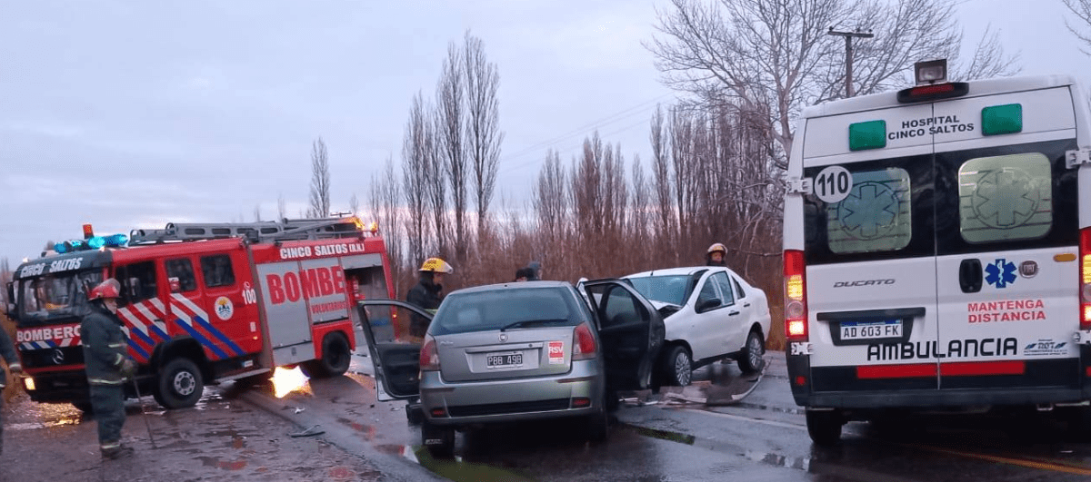 En la mañana de este sábado, alrededor de las 8:20, dos vehículos protagonizaron un choque frontal en Ruta 151, en Cinco Saltos. Por consecuencia del fuerte impacto, tres personas fueron trasladadas al hospital local. Qué se sabe.