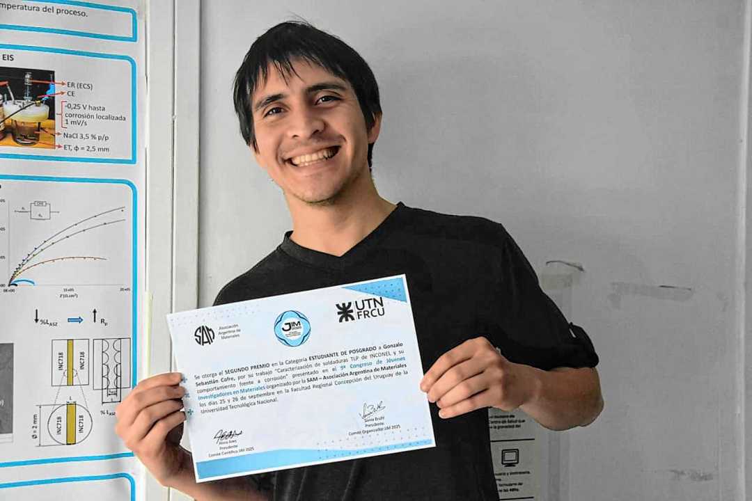 El joven rionegrino se dedicó a investigar sobre soldaduras TLP de Inconel 718 y su comportamiento frente a la corrosión, un aporte inédito en el campo de los materiales de alta performance. Y el suyo, resultó ser uno de los dos mejores trabajos de Postgrado en el 9º Congreso de Jóvenes Investigadores en Materiales (JIM 2025) a nivel país.