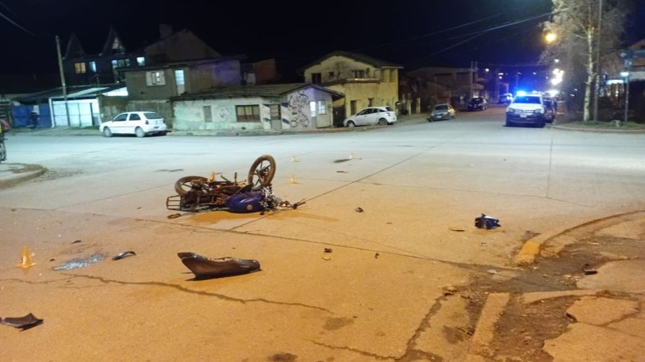 Una esquina de Bariloche fue escenario este martes por la tarde de un violento impacto entre una motocicleta y una camioneta, que en el impulso, terminó chocando contra autos que estaban estacionados en el lugar.