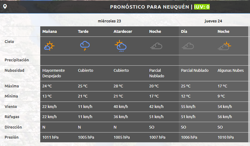 En Neuquén capital, las temperaturas oscilarán entre los 13° C y los 28° C este miércoles. Las lluvias llegará por la tarde con tormentas eléctricas que disminuirán su intensidad para el atardecer. El viento permanecerá hasta el jueves con ráfagas de hasta 56 km/h.
