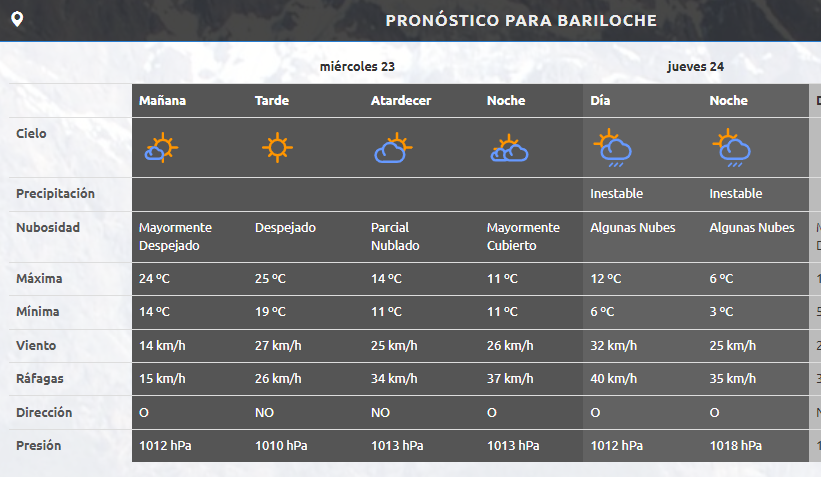 En Choele Choel las precipitaciones llegarán recién el jueves, con tormentas eléctricas por la noche. El viento también dirá presente con ráfagas que superarán los 50 km/h. Algo similar ocurrirá en Bariloche que tendrá un jueves inestable con el cielo cubierto por algunas nubes.