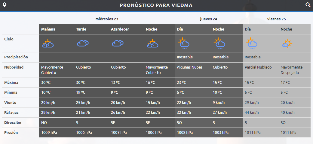 Para el Alto Valle, la AIC pronosticó jornadas inestables para las tardes del miércoles y el jueves. En Roca, el cielo estará cubierto y las temperaturas rozarán los 28°C acompañadas con ráfagas de viento que, el jueves, alcanzarán los 53 km/h.