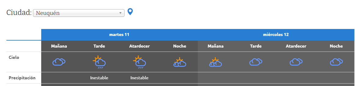 Zona centro de la provincia del Neuquén y Región Sur de Río Negro: El ingreso de aire húmedo provoca descenso de la presión atmosférica con ascenso de la temperatura. Períodos nubosos e inestables con probables lluvias y chaparrones. Jueves y Viernes períodos de viento con ráfagas mas