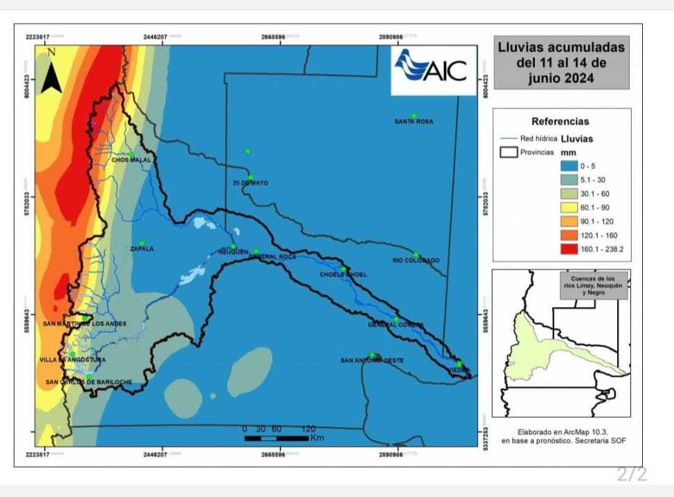 En el parte de la AIC se informó que se espera para la zona «un ascenso de la temperatura con períodos de lluvias y chaparrones persistentes» y que se mantiene esas condiciones «los próximos días». Además que habrá «mejoramientos temporarios» y que el jueves con aire frío aumenta la probabilidad de nevadas.