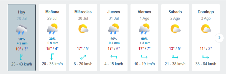 En el pronóstico del SMN, se anuncia un lunes con lluvias durante la mañana y la noche. Las temperaturas oscilarán entre los 3°C y los 11°C con cielos cubiertos. Las ráfagas de viento alcanzarán los 50 km/h.