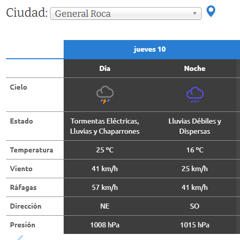 Por su parte el sitio especializado en meteorología, Meteored, detallaron que en Roca el cielo se mantendrá nublado durante toda la mañana, pero las lluvias caerán a partir de las 17 y durarán hasta aproximadamente las 23. Aunque indicó que en el medio habrá periodos de pausa y hacia el anochecer las precipitaciones serán de carácter débil.