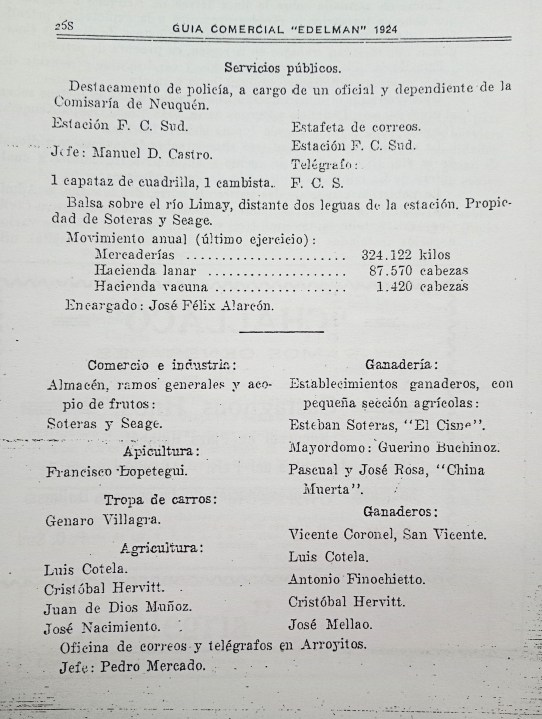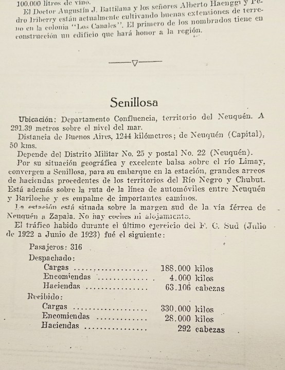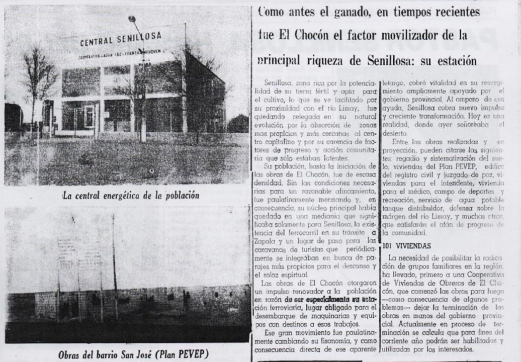 Cuenta el Archivo de RÍO NEGRO que para la década del ‘60, era muy poca la gente que vivía en Senillosa. El recuerdo viene de la mano del antiguo vecino Camilo Carrasco, entrevistado por este medio en 1998, cuando el suplemento aniversario apeló a su memoria para hablar de una zona que él ya conocía bien. “Había una huella que era la calle San Martín y que pasaba pegada a las vías del ferrocarril (…) también había un ‘boliche’ al que le decían ‘Casablanca’ y una casa de ramos generales que tenía de todo”, dijo Carrasco, en diálogo con el cronista.
