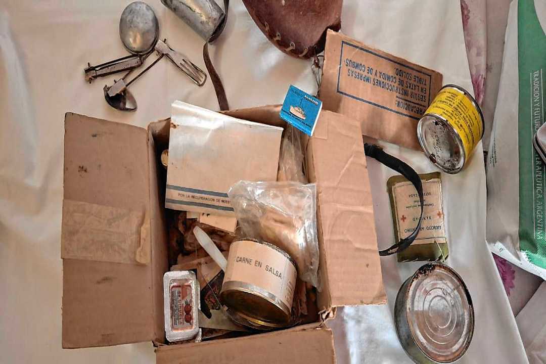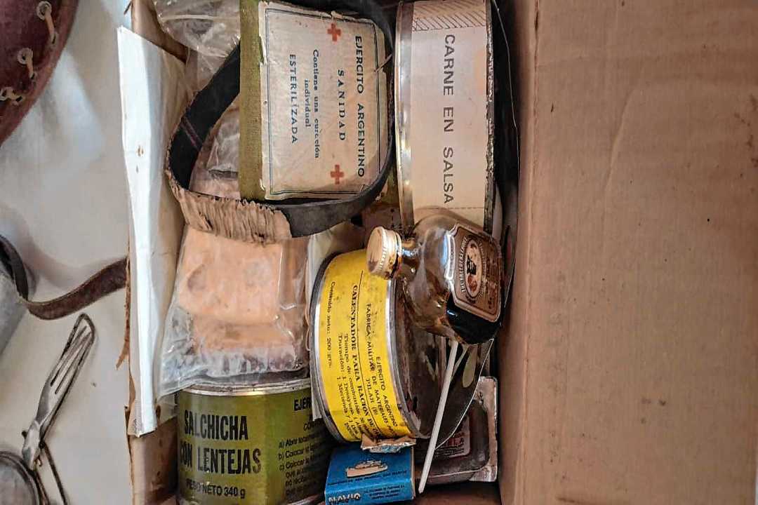 En una caja pequeña, el tiempo parece haberse detenido. Hay galletas envasadas al vacío, un calentador en gel, fósforos y un sobre que aún conserva una consigna intacta: “Por la recuperación de nuestras Islas Malvinas”. Son fragmentos de vida de personas que nunca volvieron y hoy habitan en la casa de Gregorio Garzoglio.