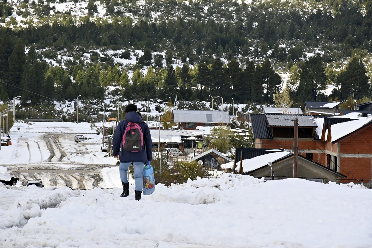 Con lentitud, Marcelina Curileo cruzaba la calle José Obrero en el barrio Nahuel Hue con temor a caerse. Donde no había nieve compacta, los piés se hundían entre grietas de agua helada.