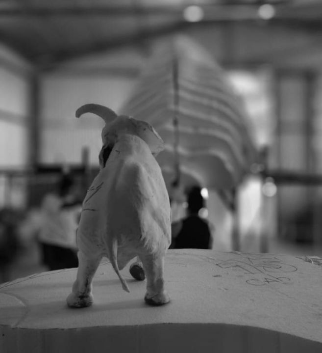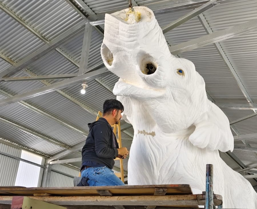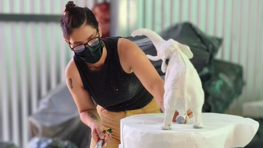 El método constructivo se basó en una estructura de caños sobre la cual se montaron piezas de poliestireno talladas con calor mediante una herramienta llamada cejelín. «Todo el volumen fue tallado y luego pegado con espuma de poliuretano sobre la estructura metálica, para después forrarlo con una resina que tiene la textura de la piel«, detalló el artista sobre la técnica.