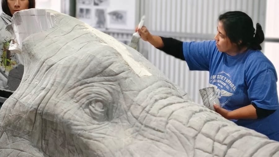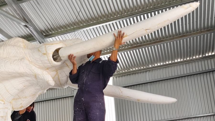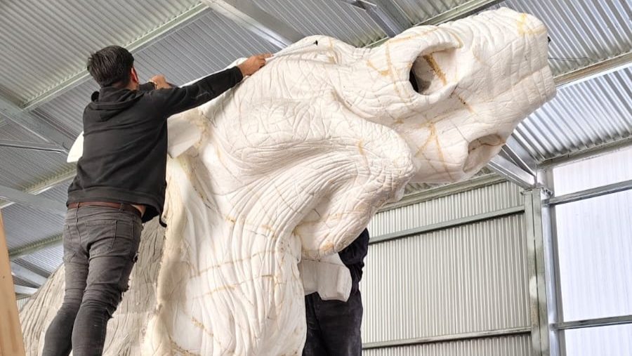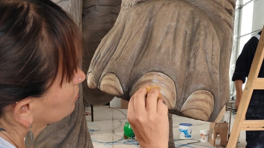 «El desafío principal fue el tamaño, es una escultura de 5 metros de largo y 4 metros de alto. A veces se complican los materiales por la distancia, pero pudimos concretar el trabajo», relató el paleoartista Marcelo Miñana. Con 20 años de experiencia en el Museo de Ciencias Naturales de Buenos Aires, Miñana lideró el taller junto a Fernando Simonetti.