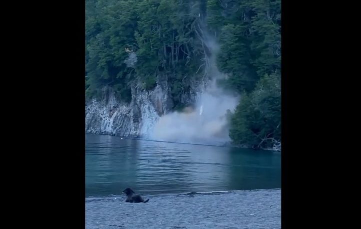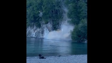 En el video se ve cómo repentinamente árboles y algunas rocas caen sobre parte de la playa del lago Nahuel Huapi, sobre la derecha de la conocida bahía de Villa la Angostura.
