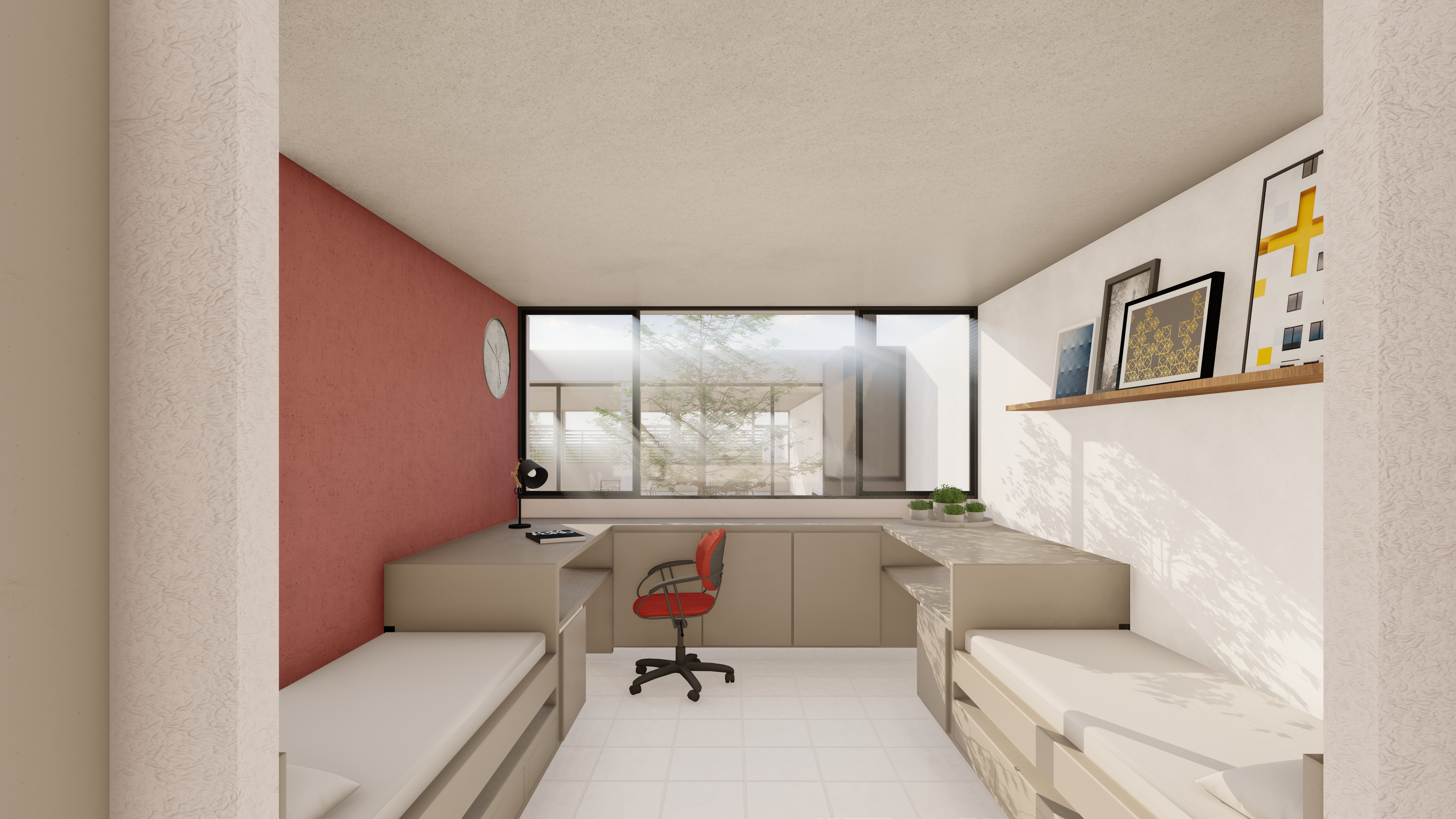 De manera independiente, se ubican bloques privados con módulos de dormitorios con servicios de baños con duchas, office y sala de estudio.