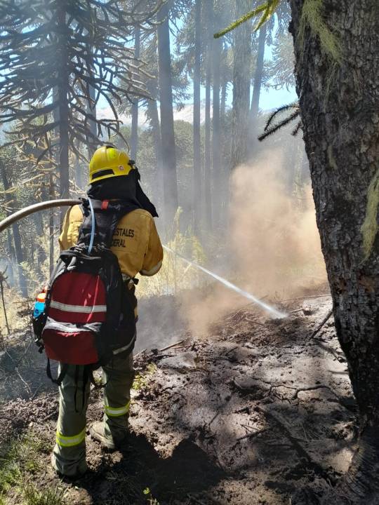 Para hoy, se espera una jornada con una temperatura máxima de 36ºC con viento del Este, pero después del mediodía rotará desde el Oeste. Mañana ingresa un frente frio que hará disminuir la temperatura e incrementará la velocidad del viento.Trabajan en el lugar brigadistas, guardaparques, protectores del Pewén, binomio, drone y técnicos.