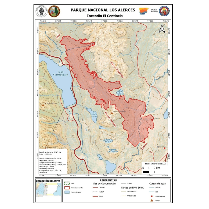 En una jornada de intenso calor, continuaron los trabajos de los brigadistas para detener el incendio que azota al Parque Nacional Los Alerces de la provincia de Chubut y que ya afectó a una superficie total de 8.315 hectáreas, aproximadamente, según informaron a Télam desde el departamento de Incendios, Comunicaciones y Emergencias (ICE) del área protegida.