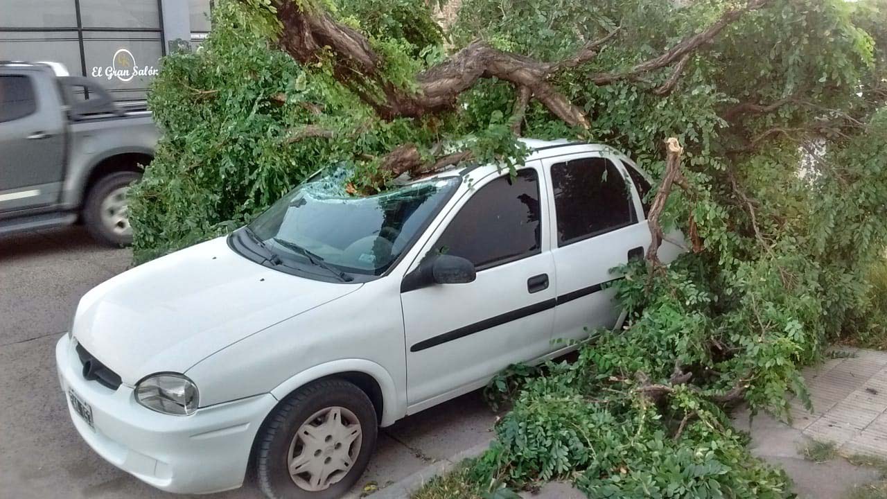 Una acacia de gran porte cayó sobre un auto marca Chevrolet Corsa que se encontraba estacionado sobre la calle Sarmiento y Roca, provocándole serios daños.