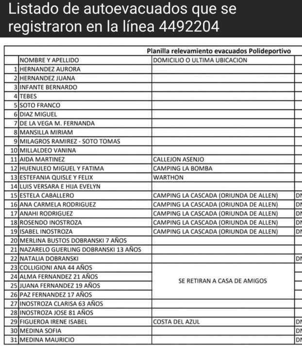A través de redes sociales y grupos vecinales se conocieron los primeros listados de los evacuados en El Bolsón. Por su parte, los refugios (Casa de Campo, Retamal y Hielo Azul) de Anprale también comunicaron los huéspedes que continúan en la montaña.