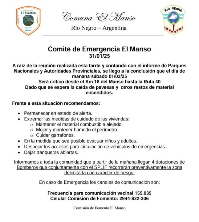 Este viernes por la tarde autoridades locales y del parque nacional Nahuel Huapi mantuvieron un encuentro para analizar el combate del fuego en las inmediaciones. En ese contexto, anticiparon para este sábado «un día crítico», al menos en el tramo que va desde el kilómetro 18 de El Manso hasta la Ruta 40. Informaron que esto será por la posible caída de pavesas y otros restos de material encendidos.