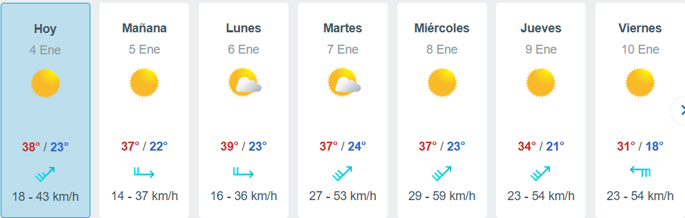 Este sábado 4 de enero en la ciudad la máxima será de 39°C, siendo el peor día al igual que el lunes. La temperatura se mantendrá hasta el jueves 9 que descenderá hasta los 34°C. Las mínimas no bajarán de los 18°C y no subirán de los 24°C.