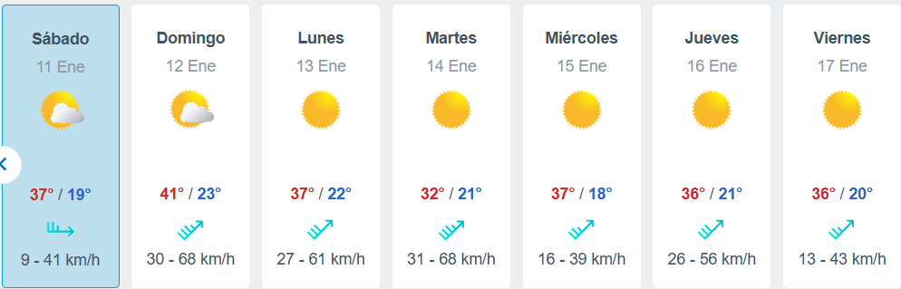 En la segunda semana aumentarán las temperaturas y se mantendrán dentro del mismo rango. El peor día de calor será el domingo con 41°C. La máxima variará entre los 36°C y los 41°C y la mínima entre los 23°C y 18°C.
