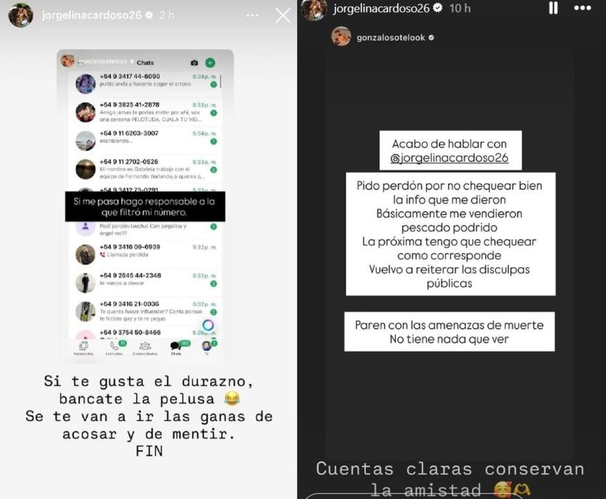 Tras este mensaje, Jorgelina Cardoso eliminó las historias en las que exponía al joven y dio por terminado el conflicto con una frase: “Cuentas claras conservan la amistad”.
