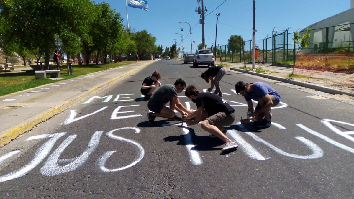 La segunda foto: en 2020 durante la pandemia, pintada sobre el asfalto de la Av. Argentina frente a Amuc, donde se desarrollaba el juicio “Escuelita VII”. “Como en ese momento las restricciones eran altas y las audiencias no podían ser masivas como estábamos acostumbrados, pusimos una leyenda para que todas las personas que pasaban por ahí supieran que, en ese lugar, a pesar de estar en pandemia, se estaban juzgando genocidas”.