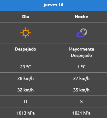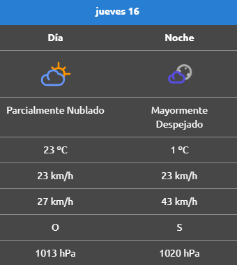Por la noche se pondrá fresco con una mínima que llegará a 1°C y el viento cambiará de dirección hacia el sur, con ráfagas superiores a los 40 km/h.