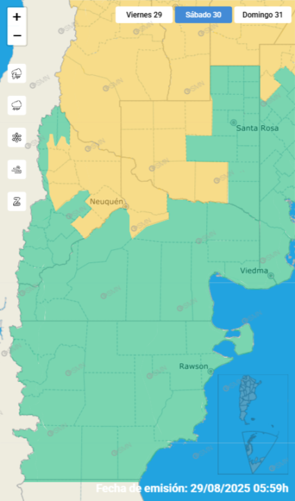 - Confluencia – Este de Añelo – Este de Pehuenches – Picún Leufú: alerta por fuertes precipitaciones durante la mañana y tarde del sábado.