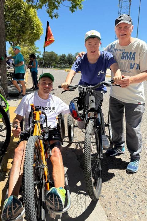 «Llegamos en 50 minutos al lugar donde pensamos que íbamos a tardar una hora y media», balancea Mauricio este mediodía en pleno descanso, tras bajarse de su bicicleta adaptada, una handbike. Ya pasaron por Belisle y Darwin. «Empezó a picar el calor», dice el para atleta.