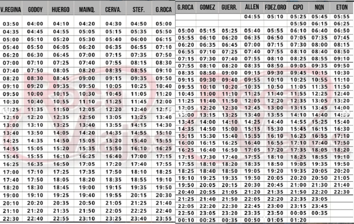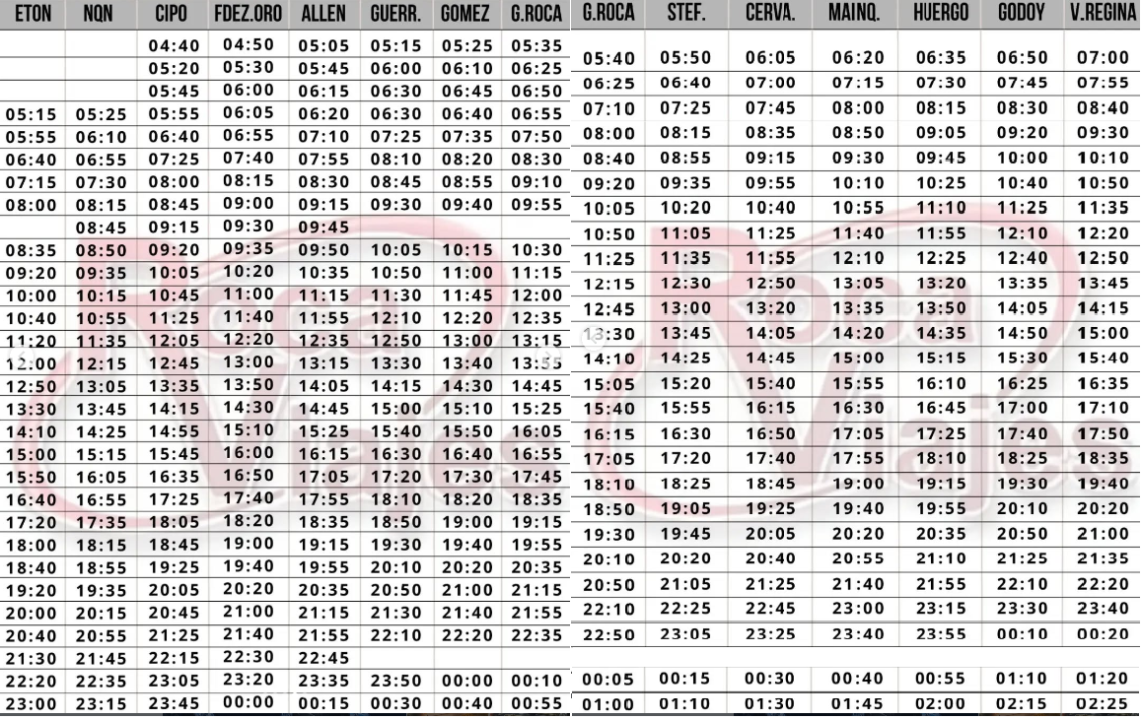 De acuerdo al comunicado difundido, en enero solo funcionarán los servicios comunes que mantendrán sus recorridos y horarios habituales. El mismo será la única opción para viajar desde Regina a Neuquén o viceversa, realizando paradas intermedias en las distintas localidades que forman parte del Alto Valle.