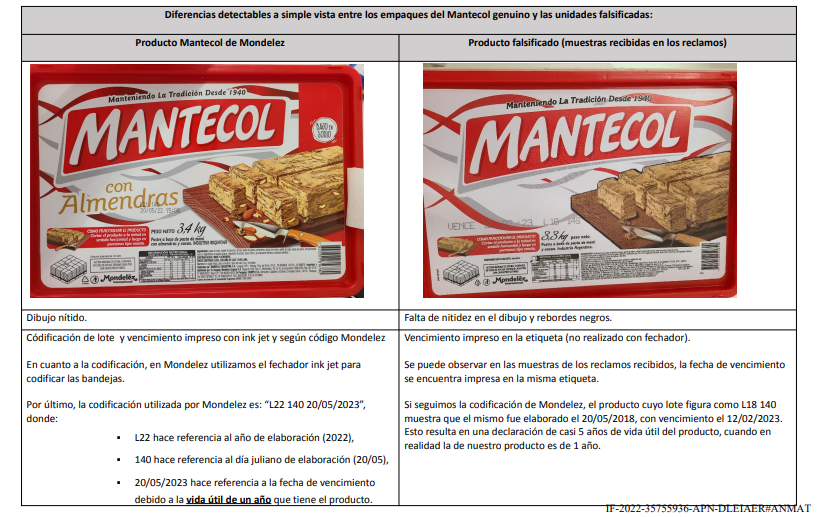 Según explicó la administración, la decisión se tomó como consecuencia de que el Departamento Vigilancia Sanitaria y Nutricional de los Alimentos del Instituto Nacional de Alimentos (INAL) tuvo conocimiento de una denuncia de la firma Mondelez Argentina SA en relación a la comercialización de este producto falsificado.