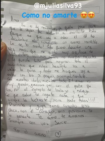 En el primer párrafo, Silva se arriesgó con la afirmación, claramente colmada de amor y confianza en su pareja: «me adelanto a escribirte esto porque se que vas a estar el 18 de diciembre ahí, cumpliendo un sueño increíble».