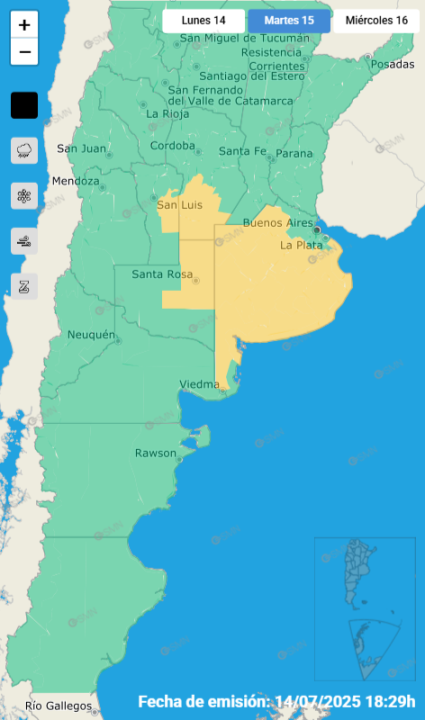 El Servicio Meteorológico Nacional (SMN) emitió una alerta amarilla por tormentas fuertes que incluye a gran parte del interior de la provincia de Buenos Aires y regiones de Córdoba, La Pampa y San Luis.
